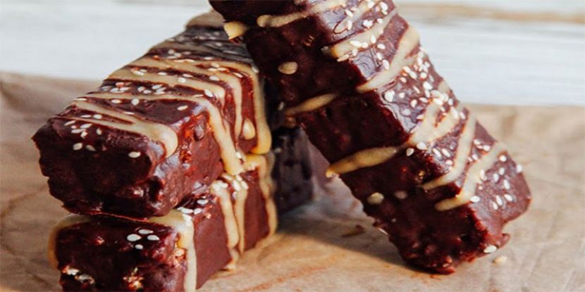 Transfer to the baking tin and, using the palm of your hand or the back of a spoon (coated in coconut oil), press the mixture down very firmly to create an even and compact bar (roughly 2 cm high). Scatter the cacao nibs on top and use a spatula to press them down slightly into the mixture.